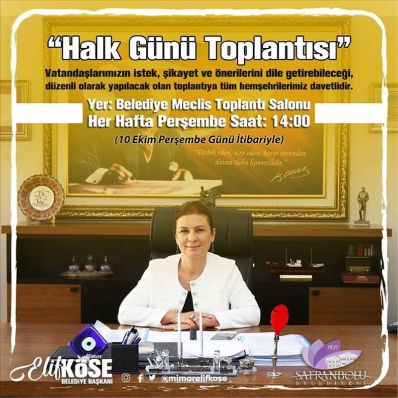 Konu ile ilgili kıs bir açıklama yapan Safranbolu Belediye Başkanı Elif Köse; “ İlk günden beri vatandaş odaklı ve şeffaf belediyecilik anlayışımızı sürdürüyoruz. Yine Safranbolulu hemşerilerimizin dertlerini, sıkıntılarını dinlemeye, birlikte çözüm üretmeye gayret ediyoruz. Bu bağlamda 10 Ekim 2019 Perşembe günü ilkini gerçekleştireceğimiz ve bundan böyle her Perşembe günü olmak üzere saat 14.00´da Belediye Meclis salonunda halkımızla buluşacağız. Safranbolulu insanımızın taleplerini alıp yine birlikte istişare edeceğiz” dedi.
