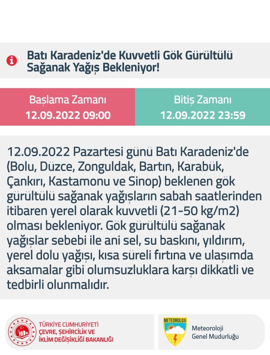 Meteoroloji Genel Müdürlüğü tarafından yapılan son tahminlere göre 12 Eylül Pazartesi günü Batı Karadeniz’de Bolu, Düzce, Zonguldak, Bartın, Karabük, Çankırı, Kastamonu ve Sinop’ta sabah saatlerinden itibaren gök gürültülü sağanak yağış bekleniyor. Metrekareye 21-50 kilogram yağış beklendiği, ani sel, su baskını, yıldırım, yerel dolu yağışı, kısa süreli fırtına oluşabileceğinden ulaşımda aksamalara karşı tedbirli olunması gerektiği bildirildi.