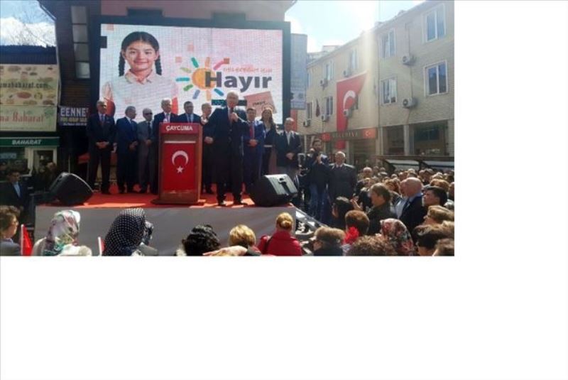 'Şimdi öyle bir hale geldik ki dostumuzu düşmanımızı şaşırdık. Dost kim düşman kim bilemez hale geldik. Bu gün dost dediğimiz düşman oluyor, düşman dediğimiz yarın dost oluyor. Tutun Mavi Marmara´dan İsrail ile ilişkilerden, Rusya ile Amerika ile ilişkilerden, Ruslar 4 evladımızı şehit etti. Özür dilenmesini talep edemedik. Ne oluyor Türkiye´nin saygınlığı eski saygınlık mi? Sözü eski ağırlığını taşıyor mu? Herkese tepeden tırnağa badanayı yapıyoruz. Olan bize oluyor. Hollanda´da 465 bin kişi çalışıyor. Yanlarındaki Hollandalılar düşman gibi bakıyor. Antalya´daki bütün otellerde rezervasyon iptal ediliyor. Sen kabadayılık yapacaksın diye değer mi? Güçlü olacaksın. Dün de enteresan bir şey söyledi. Tek adam diyenler Mustafa Kemal Atatürk´e hakaret ediyor dedi. Atatürk´e hakaret ediyormuşuz. Çünkü Atatürk de tek adammış. Mustafa Kemal, İzmir işgal edildikten sonra artık karar verdi. 19 Mayıs 1919´da Samsun´dan Anadolu´ya geçti. İlk tamimi “Milletin istiklalini yine milletin azmi ve kararı kurtaracak” dedi. Meclisi inşa etmeye çalıştı. Tek adam olmayı reddeden adamdır o. Sen tek adam ol diyenlere hayır diyen adamdır. Ve o meclis tek adam yapalım diye teklif getirenlere yüzüne bakarak hayır biz meclisi feshetme yetkisini vermiyoruz diyen bir meclistir. Şimdi sana hayır diyebilecek bir babayiğit var mı? Şimdi ne Başbakan kalacak, ne bakan kalacak ne bakanlar kurulu kalacak. Ne mahkeme kalacak. Basın zaten susmuş. İş adamlarının sesi çıkamaz hale gelmiş. Bu tek adamlık değil mi? Aman ha Türkiye´nin 100 yıllık yolculuğunu geri getirmeyin. Bu yolun sonu ileride aydınlıktır. Hukukun üstünlüğüdür. Herkesin eşitliğidir. Bu yol oraya doğru gidiyor. Geri çevirdik mi ligden küme düşeriz. Bunların kampanyasını Cumhurbaşkanı, Başbakan yapıyor. Cumhurbaşkanı tarafsız. Şimdi bir rektör ‘Evet´ diyeceğim diye ortaya çıktı. Bu defa bir Kaymakam ortaya çıktı. Arkadan bir baktım savcı çıktı. Devletin bütün bürokrasisi hepsi ortada. Arkadaş size soran mı var? Bir tane oyun var. İstediğini kullan. Kime diyorsun, amacın ne? Kaymakam bey, senin ilçende evet diyecek de var hayır diyecek de var? Hayır diyecek olana nasıl yaklaşacaksın. Kaymakam aslında ne oy vereceğini tebliğ etmenin ötesinde birilerine Valilik dilekçesi veriyor. Rektör YÖK başkanı olmaya yönelik dilekçe veriyor. Savcı bey de Yargıtay´da üyelik peşinde anlaşılan. Gidin kardeşim milletin ne kafasını karıştırıyorsun. Zaten kampanya yapılıyor.'