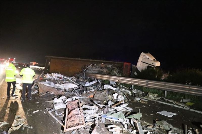Bolu´da, TEM Otoyolunda kontrolden çıkarak bariyerlere çarpan hurda yüklü tır devrildi. Tırdan yola dökülen hurdalar başka bir aracın kaza yapmasına neden oldu.