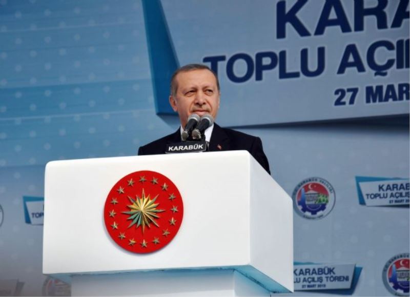 Çanakkale Savaşlarının 100 yıl dönümüne değinen Cumhurbaşkanı Erdoğan, “18 Mart’ta deniz zaferimizin 100. yıl dönümünü başbakanımızın Çanakkale’ye katılımıyla gerçekleştirdik. 24 Nisan da da kara savaşlarının 100. yıl dönümüdür. Dünyanın 4 bir yanından gelen dostlarımız var. Devlet başkanları, hükümet başkanları ve gelecek olan dostlarımızla kapsamlı bir programla yad edeceğiz. İstanbul’da büyük bir barış zirvesi yapacağız. 24’ünde Çanakkale’ye geçeceğiz. 25’inde de Avustralya’dan, Yeni Zelanda’dan gelen tüm dostlar orada şafak ayinlerinde törenlerini yapacaklar. Bizim gençliğimizde sabah namazına müteakip şafak yürüyüşü yapacak. Gençleri şimdiden oraya davet ediyorum. Çanakkale’nin kahramanları arasında Safranbolulu, Eflanilili, Uluslu, Eskipazarlı, Yeniceli yani Karabüklü tüm kardeşlerimin dedeleri, büyük dedeleri var. Kendilerinden kat ve kat güçlü düşman karşısında fedakarca savaşan bu 42. Alay, bine yakın şehit 2 bin 500’e yakın yaralı vermişti. Bu alayın önemli bölümü Karabük’ten, Karabük’ün ilçelerinden, bu bölgelerden gelenlerden oluşuyordu. Savaş sonunda binlerce mevcudundan geriye ne kalmıştı biliyor musunuz? 7-8 kişinin kaldığı bu alayın kahramanlığı gurur tablolarımızdan biri olarak tarihteki yerini aldı. Bu millet ne büyük bir millet. Bu gazi alayın kahraman askerlerinin torunları olan Karabüklü kardeşlerime bir kez daha saygılarımı sunuyorum” şeklinde konuştu.