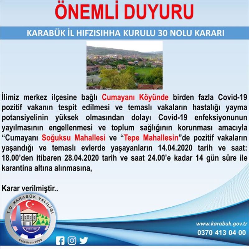 Karabük merkez Cumayanı Köyünde artış gösteren yeni tip korona virüs (Covid-19) vakalarının fazla olması nedeniyle Cumayanı Soğuksu Mahallesi ve Tepe Mahallesi de karantina altına alındı.