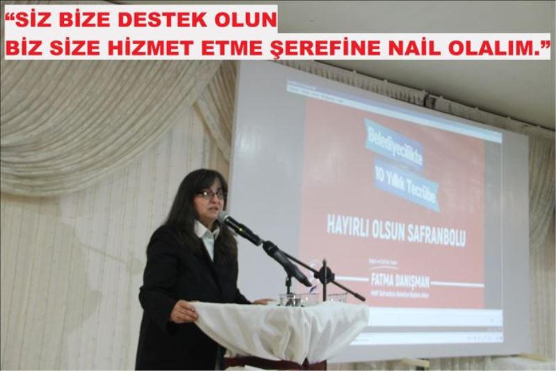 MHP Safranbolu Belediye Başkan Adayı Fatma Danışman, “Teknik konularla ilgili problem çözmek çok kolay. Belediye gelirlerini peşkeş çekmediginizde, elinizi, elleri kasaya sokmadığızda bu projeler tek tek hayata geçiyor. En zor olan şey gönül kazanmak. Allah´ın izniyle, sizlerin desteğiyle bu görev bize nasip olursa gönül kazanmaya, sizlerin gönlüne ve desteğine talibiz. Ben 10 yıllık tecrübemi memleketime sunmak istiyorum. Hepsinden desteklerini bekliyorum. Siz bize destek olun biz size hizmet etme şerefine nail olalım.” dedi.