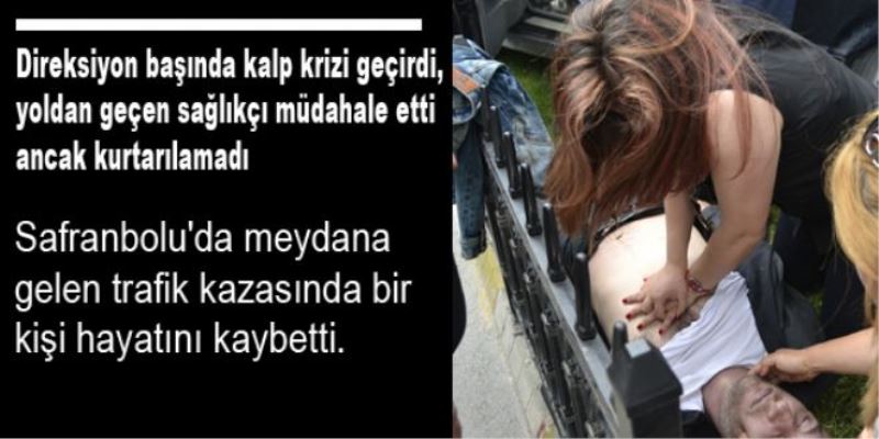Safranbolu`da direksiyon başında kalp krizi geçirerek kaza yapan sürücüye yoldan geçen bir sağlıkçı kalp masajı yaparak müdahale etti. Sadri Artunç Caddesi üzerinde 78 ST 651 plakalı otomobil sürücü Cengiz Sarıkaya (38), direksiyon başında kalp krizi geçirerek orta refüje çarptı. Sürücü çevredeki vatandaşların yardımıyla otomobilden çıkarılırken, o sırada yoldan geçen bir sağlıkçı Sarıkaya`ya kalp masajı yaparak müdahale etti. Olay yerine ambulans gelirken Sarıkaya, ambulanssa bindirilerek Safranbolu Devlet Hastanesine kaldırıldı.