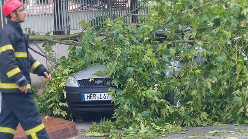 Fırtınada devrilen ağaç dalı otomobilin üzerine düştü