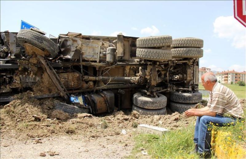 Karabük´te freni boşalan kum yüklü kamyon orta refüje çıkarak devrildi. Kaza sonrası panikle korkan kamyon sürücüsü ise olay yerini terk ettikten yarım saat sonra geri geldi