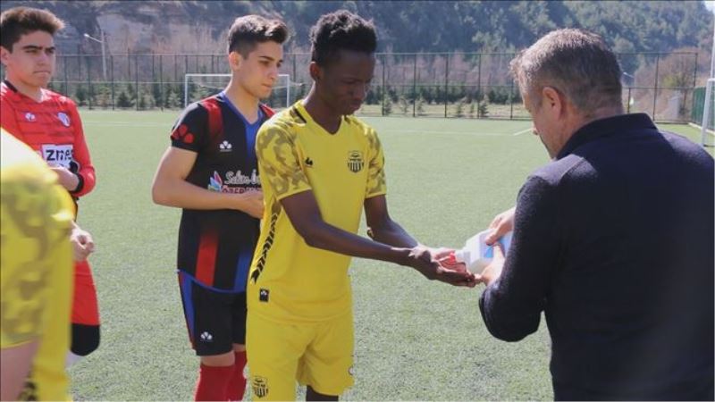 Karabük U19 Ligi´nde mücadele eden Aydınlıkevler Gençlik ve Spor Kulübü ile Karabük Köyüspor maçı öncesi futbolcular, dezenfektan ile ellerini temizledi.