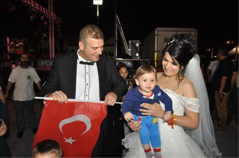 Ayrıca ellerinde Türk bayraklarıyla vatandaşlara destek vermek için nikah masasından kalkıp gelinlik ve damatlıkla Kent Meydanına gelen Merve ve Kadir Şahin çifti, darbe girişime kalkan hainlerin karşısında olduklarını ve bu vatan için birer polis, asker ve şehadet şerbetini içebilecek insanlar olduklarını belirterek, “Biz buraya 1071´de Malazgirt ile girdik.Kendine güvenen geldi, geldikleri gibi gittiler. Bu saatten bu tarihten sonra hepimiz polis, hepimiz askeriz hepimiz şehadet şerbetini içmeye hazır kişileriz. Biz bu vatan için canımızı ortaya koyarız. Gördük ki bu vatana feda edilecek canlar lazımmış. Büyüklerimden özür dileyerek söylüyorum bu konuda çalışmalarımız başlayacak. Bir ölür bin diriliriz.” dedi.
