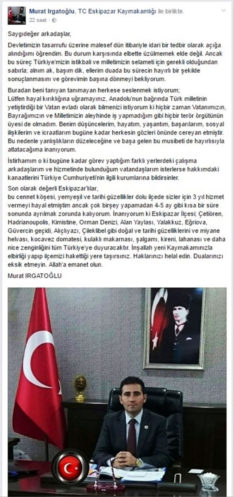 Konuyla ilgili olarak sosyal medya hesabından açıklamalarda bulunan Kaymakam Murat Irgatoğlu, “Devletimizin tasarrufu üzerine malesef dün itibariyle idari bir tedbir olarak açığa alındığımı öğrendim. Bu durum karşısında elbette üzülmemek elde değil. Ancak bu süreç Türkiye´mizin istikbali ve milletimizin selameti için gerekli olduğundan sabırla; alnım ak, başım dik, ellerim duada bu sürecin hayırlı bir şekilde sonuçlanmasını ve görevimin başına dönmeyi bekliyorum.”