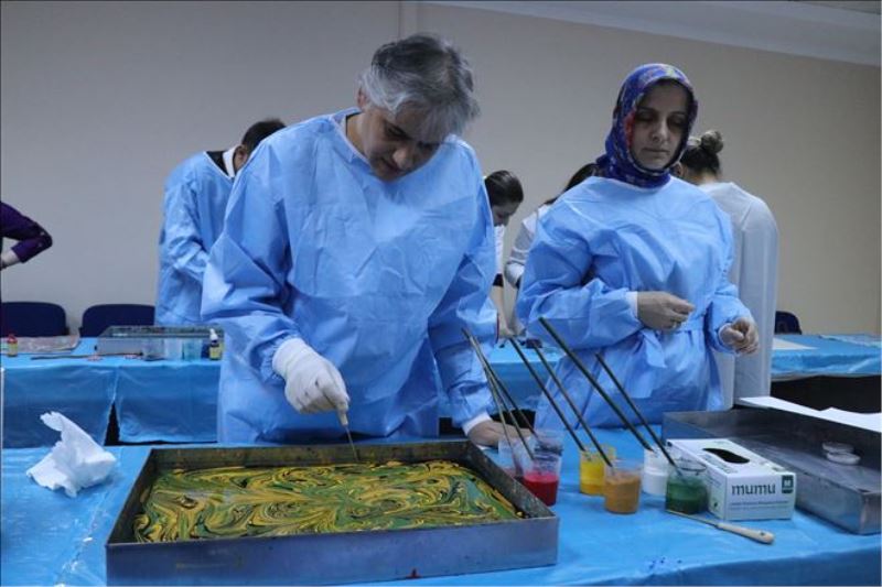 Bolu´da, Sağlık Müdürlüğü tarafından başlatılan “Sanatla Mutlu Ol” projesi kapsamında fizik tedavi, diyaliz, dahiliye, onkoloji ve palyatif servislerinde tedavi gören hastalar, İzzet Baysal Devlet Hastanesi´nde ayrılan özel bir alanda ebru sanatını öğreniyor. Doktorların izin verdiği saatlerde belirlenen özel sınıfa gelen hastalar, Bolu Milli Eğitim Müdürlüğü ve Halk Eğitim Merkezi´nde görevli öğretmenlerle beraber ebru yaparak, tedavilerinde geçirdikleri zorluklara karşı motive oluyorlar.