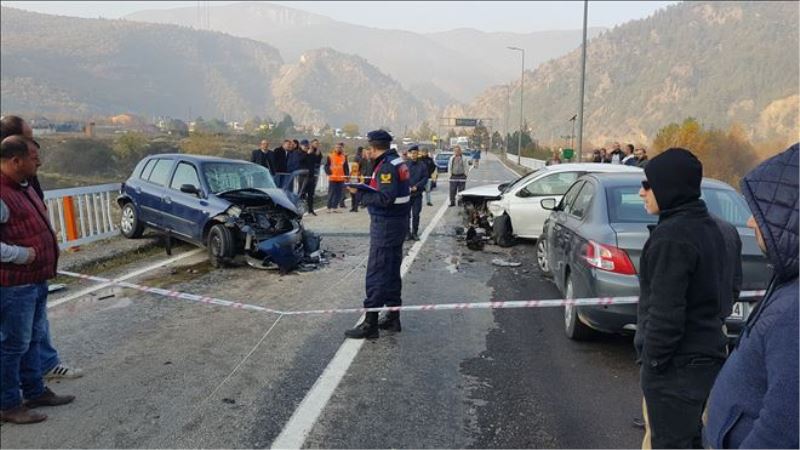Edinilen bilgilere göre, kaza Karabük - Yenice Karayolu Pirinçlik mevkisi Filyos 4 köprüsü üzerinde meydana geldi. Yenice istikametine giden Vedat Genç (33) yönetimindeki 06 BGH 954 plakalı otomobil, Filyos 4 Köprüsü üzerinde hatalı sollama yapınca karşı istikametten gelmekte olan Ali Koymat (52) idaresindeki 78 YA 984 plakalı otomobil ile kafa kafaya çarpıştı. Bu sırada aynı istikamete gitmekte olan Devlet Işıldar´ın (45) kullandığı 55 AUY 94 plakalı otomobilde duramayarak diğer araca çarptı. Kazada Ali Koymat´ın kullandığı otomobilin köprüden Filyos Çayı´na düşmesini ise korkuluklar önledi.