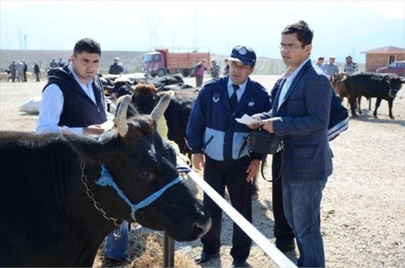 Safranbolu Kastamonu yolu üzerinde kurulan hayvan pazarında Safranbolu Belediyesi ekipleri tarafından hayvanların kurbana elverişli olup olmadıkları ve yaş kontrolleri ile girişlerin kontrol altına alınmasını için denetimlerini sürdürüyor.