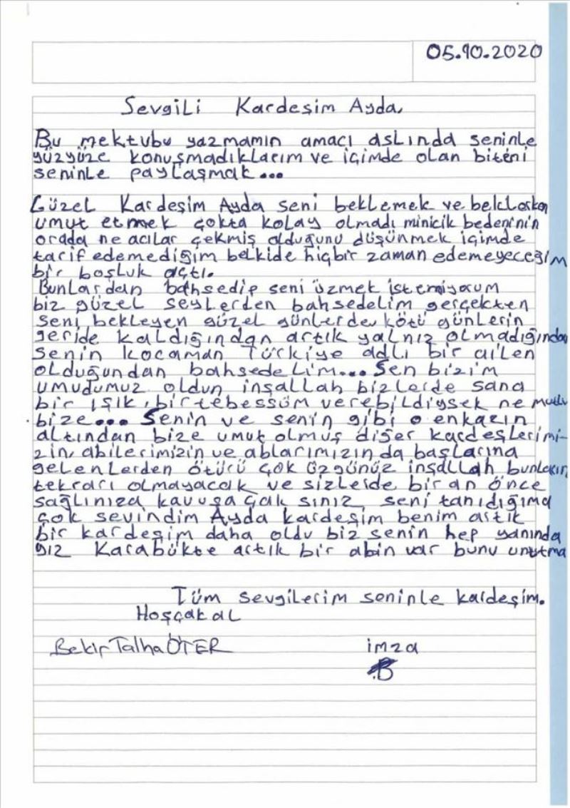 İlkokul öğrencisi Bekir Talha Öter ise mektubu yazmasının amacının içinde olan biteni Ayda bebekle paylaşmak olduğunu belirterek, “Güzel kardeşim seni beklemek ve beklerken umut etmek çok da kolay olmadı. Minicik bedeninin orada ne acılar çekmiş olduğunu düşünmek içimde tarif edemediğim belki de hiçbir zaman edemeyeceğim bir boşluk açtı. Bunlardan bahsedip seni üzmek istemiyorum. Biz güzel şeylerden bahsedelim. Gerçekten seni bekleyen güzel günlerden. Artık yalnız olmadığından ve senin kocaman Türkiye adlı bir ailen olduğundan bahsedelim. Sen bizim umudumuz oldun. İnşallah bizler de sana bir ışık, bir tebessüm verebildiysek ne mutlu bize. Senin ve senin gibi o enkazın altından bize umut olmuş diğer kardeşlerimizin abilerimizin ablalarımızın da başlarına gelenlerden ötürü çok üzgünüz. İnşallah bunları tekrarı olmayacak ve sizlerden bir an önce sağlığınıza kavuşacaksınız. Seni tanıdığıma çok sevindim Ayda kardeşim benim. Artık bir kardeşim daha oldu. Biz senin hep yanındayız, Karabük´te artık bir ağabeyin var bunu unutma” ifadelerine yer verdi.