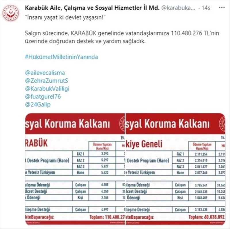 Karabük Aile, Çalışma ve Sosyal Hizmetler İl Müdürlüğü sosyal medya hesabından yapılan paylaşımda, '´İnsanı yaşat ki devlet yaşasın!´ Salgın sürecinde, KARABÜK genelinde vatandaşlarımıza 110.480.276 TL´nin üzerinde doğrudan destek ve yardım sağladık.' denildi.