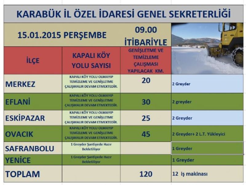 Karabük Özel İdaresi tarafından yapılan açıklamaya göre bugün Saat 09:00 itibari ile il genelinde kapalı köy yolu kalmadı. Karabük Özel İdaresi Kar Mücadelesi Ekipleri Merkez-Eflani-Eskipazar- Ovacık ilçelerinde 8 Greyder ve 2 Lastik Tekerlekli yükleyici (Kato) olmak üzere toplam 10 iş makinası ile köy yollarında temizleme ve genişletme çalışmalarına devam ediyor. Karabük Özel İdaresine ait 2 greyderde Safranbolu ve Yenice Şantiyesinde hazır bekletiliyor.