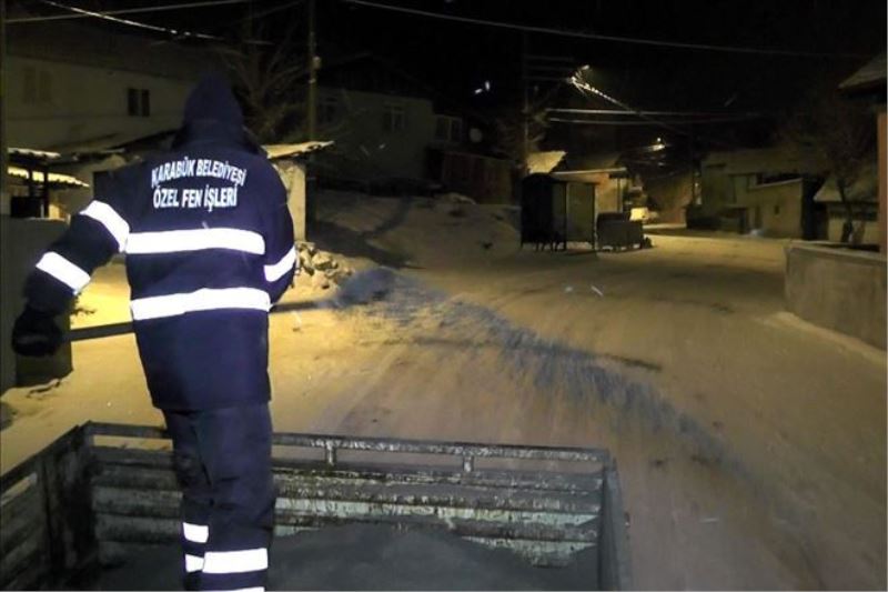Karabük Belediyesi acil müdahale ekipleri kar yağışının başlamasıyla birlikte il genelinde hayatın olumsuz etkilenmemesi için tedbir aldı. Ekipler kar yağışı başlamadan özellikle gece sabaha kadar tuzlama çalışması yaparken mesai saatleri içinde trafiği sıkıntıyı sokmayacak şekilde çalışıyor Vatandaşların mağduriyet yaşamamaları için seferber olan ekipler yollarda sürdürdüğü çalışmalarına devam ediyor. Karabük Merkez ve Mahallelerinde toplam altı ekip olmaz üzere 9 kamyonet, iki greyder ve 25 personel ile birlikte olası buzlanmaya karşı tuzlama ve kar silme çalışmalarına devam eden Karabük Belediyesi ekipleri, il sınırları içerisinde herhangi bir olumsuzluğun yaşanmaması için 3 vardiya halinde 24 saat mesai yapıyor. Ekipler ilk olarak Hastane bölgeleri, okullar bölgesi ve otobüs güzergahlarının bulunduğu yollarda, ardından da bütün mahallelerde ulaşımın rahat sağlanabilmesi ve olası buzlanmaya karşı kar temizleme ve tuzlama çalışmalarını aralıksız sürdürdü. Ayrıca, 153 Zabıta ihbar hattına gelen şikayetlere de anında müdahale edildi.