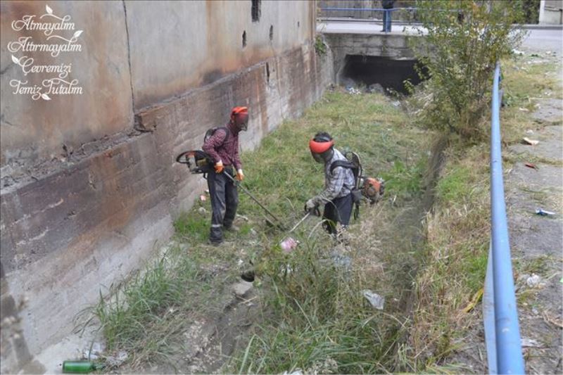 Temizlik İşleri Müdürlüğüne bağlı ekipler tarafından gerçekleştirilen çalışmada, özellikle dere yatağı içindeki otlar ve ağaçlar, sel sularının akışını engelleyip taşkınlıklara sebep oluşturmaması için temizleniyor.