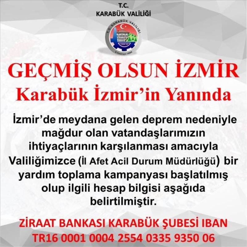Karabük Valiliği´nden yapılan açıklamada, “İzmir´de meydana gelen deprem nedeniyle mağdur olan vatandaşlarımızın ihtiyaçlarının karşılanması amacıyla Valiliğimizce (İl Afet Acil Durum Müdürlüğü) bir yardım kampanyası başlatılmış olup Ziraat Bankası Karabük Şubesi IBAN: TR16 0001 0004 2554 0335 9350 06 nolu hesaba bağış yapılabilir' ifadelerine yer verildi.