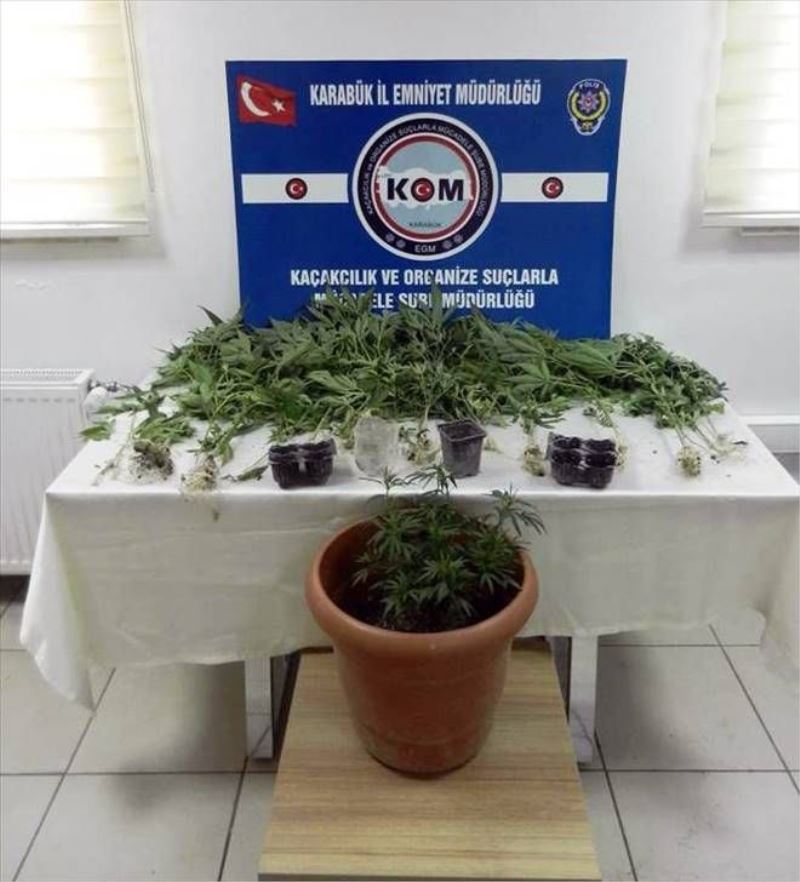 Edinilen bilgiye göre, Karabük Emniyet Müdürlüğü Kaçakçılık ve Organize Suçlarla Mücadele Şube Müdürlüğü ekiplerinin uyuşturucuyla mücadele çalışmalarında, Karabük´ün 5000 Evler Mahallesinde 17 numaralı cadde üzerindeki M..T(37) isimli şahsa ait ikametin bahçesinde yapılan aramada, 1 adet saksı içinde ve 20 adet bahçeye ekili halde hint keneviri ele geçirildi. Boyları 15 ile 100 cm arasında değişen toplamda 21 kök hint keneviri bitkisi Karabük Emniyet Müdürlüğü Kaçakçılık ve Organize Suçlarla Mücadele Şube Müdürlüğü ekiplerince toplandı. M.T. (37) isimli şahıs gözaltına alınırken hakkında adli işlem başlatıldı.