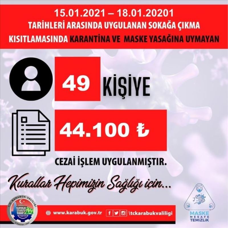 İçişleri Bakanlığınca 81 ile gönderilen genelge ile 15 Ocak 2021 Cuma saat 21.00 ile 18 Ocak 2021 Pazartesi günü saat 05.00 saatleri arasında uygulanan sokağa çıkma kısıtlaması sona erdi. Karabük Valiliği 56 saatlik sokağa çıkma kısıtlaması süresi boyunca kent genelinde 49 kişinin ihlal ettiğini açıkladı.