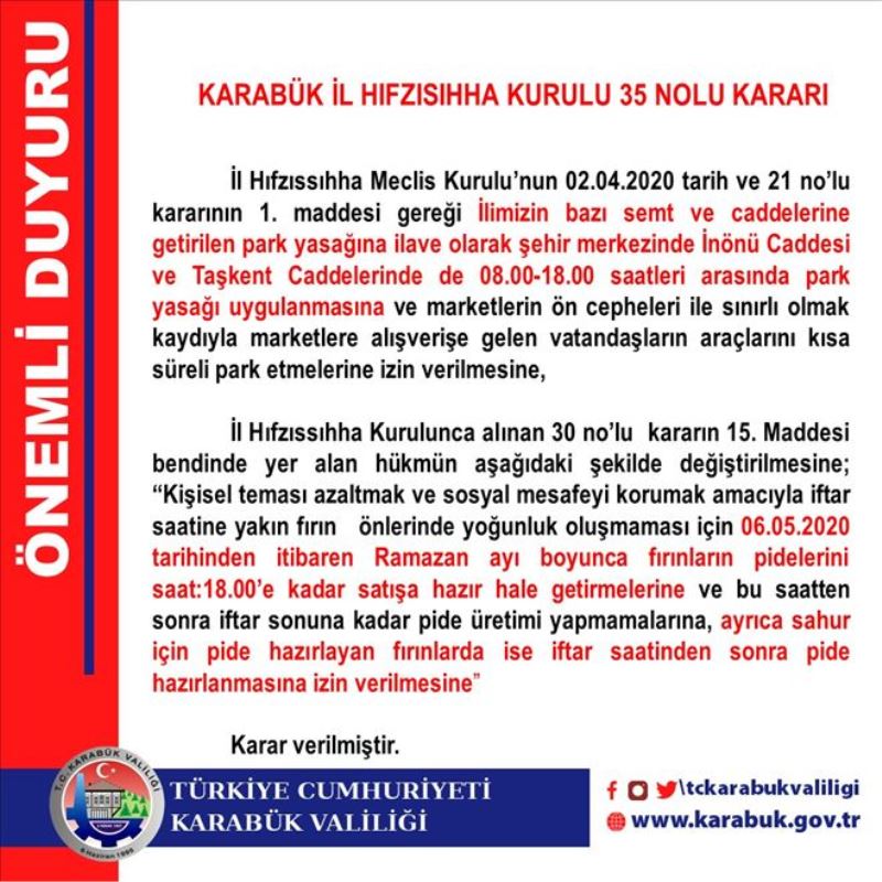 Karabük İl Hıfzıssıhha Kurulu tarafından bazı semt ve caddelere park yasağına ilave olarak şehir merkezinde İnönü ve Taşkent caddelerinde 08.00-18.00 saatleri arasında park yasağı uygulaması başlatıldı. İl Hıfzıssıhha Kurulu ayrıca, marketlerin ön cepheleri ile sınırlı olmak kaydıyla marketlere alışverişe gelen vatandaşların araçlarını kısa süreli park etmesine izin verilmesine karar verdi. Valilikten yapılan açıklamada, kişisel teması azaltmak ve sosyal mesafeyi korumak amacıyla iftar saatine yakın fırın önlerinde yoğunluk oluşmaması için 6 Mayıs tarihinden itibaren ramazan ayı boyunca fırınların pidelerini saat 18.00´a kadar satışa hazır hale getirmelerine, bu saatten sonra iftar sonuna kadar pide üretimi yapmamalarına, sahur için pide hazırlayan fırınlarda ise iftar saatinden sonra pide hazırlanmasına izin verildiği kaydedildi.