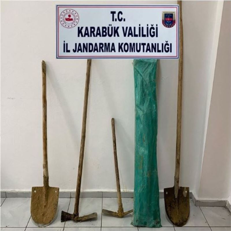 Edinilen bilgiye göre, Karabük İl Jandarma Komutanlığı ekipleri tarafından merkez ilçeye bağlı bir köyde, kaçak kazı yaptıkları tespit edilen M.İ. (43) ve A.K. (42) suçüstü yakalandı. İki kişi gözaltına alınırken, 2 adet kazma, 2 adet kürek ve 1 adet branda olmak üzere muhtelif suç aletlerine el konuldu.