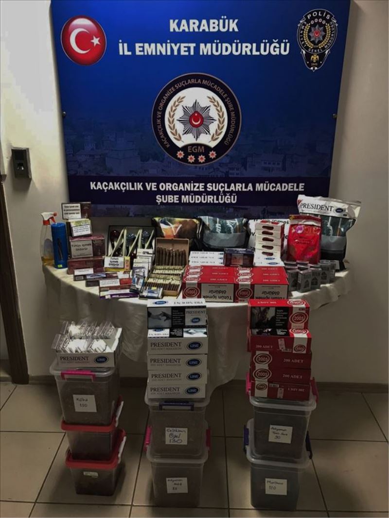 Yapılan operasyonda, iki kişi gözaltına alınırken, şahıslara ait iş yerinde yapılan aramalarda; 5 adet sigara sarma makinesi, 304 adet sigara ağızlığı, 5 bin 600 adet boş makaron, 300 adet doldurulmuş makaron, 47 adet sigarillo, 10 adet puro, 8 bin 900 gram kıyılmış tütün, 3 bin 757 gram nargile tütünü, bir adet nargile seti, 140 gram nargile esansı, 2 bin gram nargile kömürü, 6 adet pipo ele geçirildi.