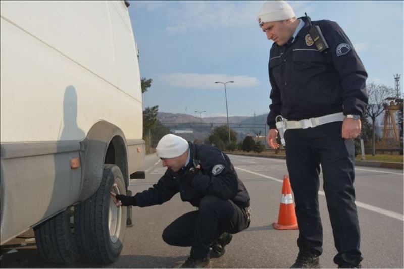 Trafik Tescil ve Denetleme Şube Müdürlüğü ekipleri, şehrin giriş noktalarında durdurduğu yük ve yolcu taşıyan ticari araçlarda kış lastiği kontrolü yaptı.