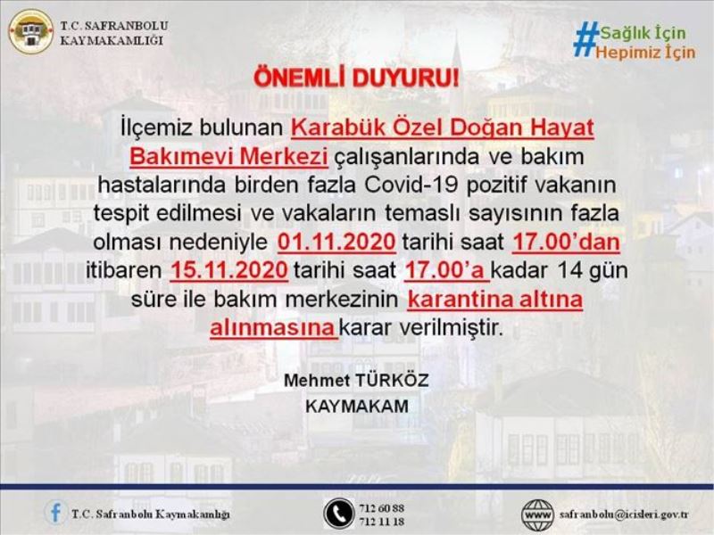 İlçeye bağlı Bostanbükü köyünde bulunan Karabük Özel Doğan Hayat Bakımevi Merkezi çalışanlarında ve bakım hastalarından birden fazla Covid-19 pozitifli vakalar tespit edildi. Konuyla ilgili Safranbolu Kaymakamlığı tarafından yapılan açıklamada, “Temaslı sayının fazla olması nedeniyle 01.11.2020 tarihi saat 17.00´dan itibaren 15.11.2020 tarihi saat 17.00´a kadar 14 gün süre ile bakım merkezinin karantina altına alınmasına karar verilmiştir” denildi.
