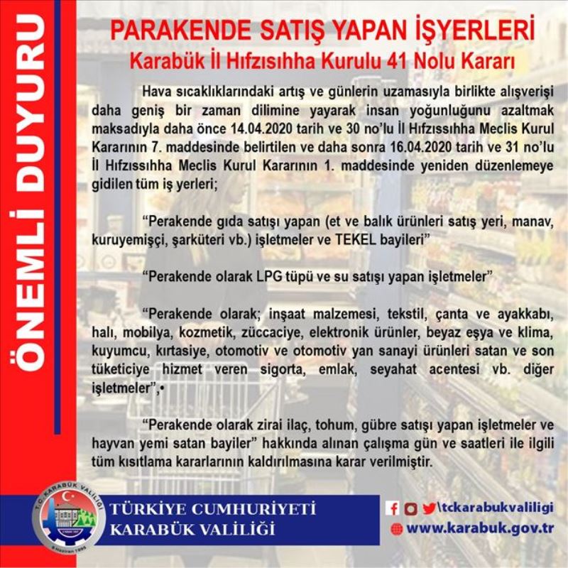 'Hava sıcaklığındaki artış ve günlerin uzamasıyla birlikte alışverişi daha geniş bir zaman dilimine yayarak insan yoğunluğunu azaltmak maksadıyla daha önce 14 Nisan 2020 tarih ve 30 nolu İl Hıfzıssıhha Meclis Kurul Kararının 1. maddesinde yeniden düzenlemeye gidilen tüm işyerleri, perakende gıda satışı yapan et ve balık ürünleri satış yeri, manav, kuruyemişçi şarküteri ve benzeri işletmeler ve tekel bayileri, perakende olarak LPG tüpü ve su satışı yapan işletmeler, perakende olarak inşaat malzemesi, tekstil, çanta ve ayakkabı, halı, mobilya, kozmetik, züccaciye, elektronik ürünler, beyaz eşya ve klima kuyumcu, kırtasiye, otomotiv ve otomotiv yan sanayi ürünleri, satan ve son tüketiciye hizmet veren sigorta, emlak, seyahat acentesi ve benzeri diğer işletmeler, perakende olarak zirai ilaç, tohum, gübre satışı yapan işletmeler ve hayvan yemi satan bayiler hakkında alınan çalışma, gün ve saatleri ile ilgili tüm kısıtlama kararlarının kaldırılmasına karar verilmiştir.'