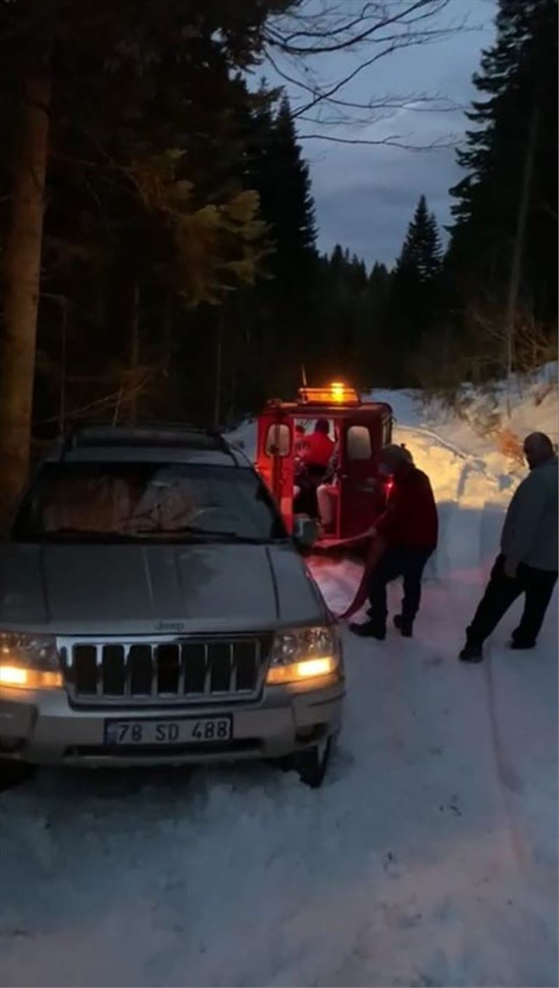 Safranbolu´da gezintiye çıkan bir grup arkadaş Sarıçiçek ve Ahmet Usta arasında yer alan jandarma mezarlığı mevkiinde araçları kar kaplı yolda kaldı. Kar ve buzlanmadan dolayı aracı saplandığı yoldan çıkaramayan vatandaşlar durumu KARDOOF ekiplerine bildirdi. Bunun üzerine paletli kar aracı ile olay yerine varan ekipler halat yardımı ile karlı yolda sağlanan aracı kurtardı.