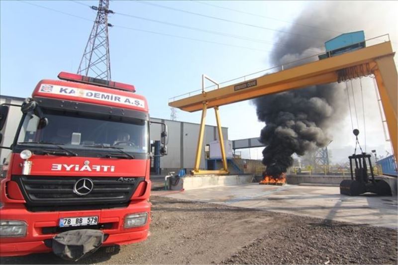 KARDEMİR´de, Merkezi Arıtma Tesisi´nde tatbikat gereği çıkartılan yangının, köpük konsantresiyle söndürüldüğü ve vinç üzerinde dumandan etkilenerek bayılan personelin kurtarıldı.
