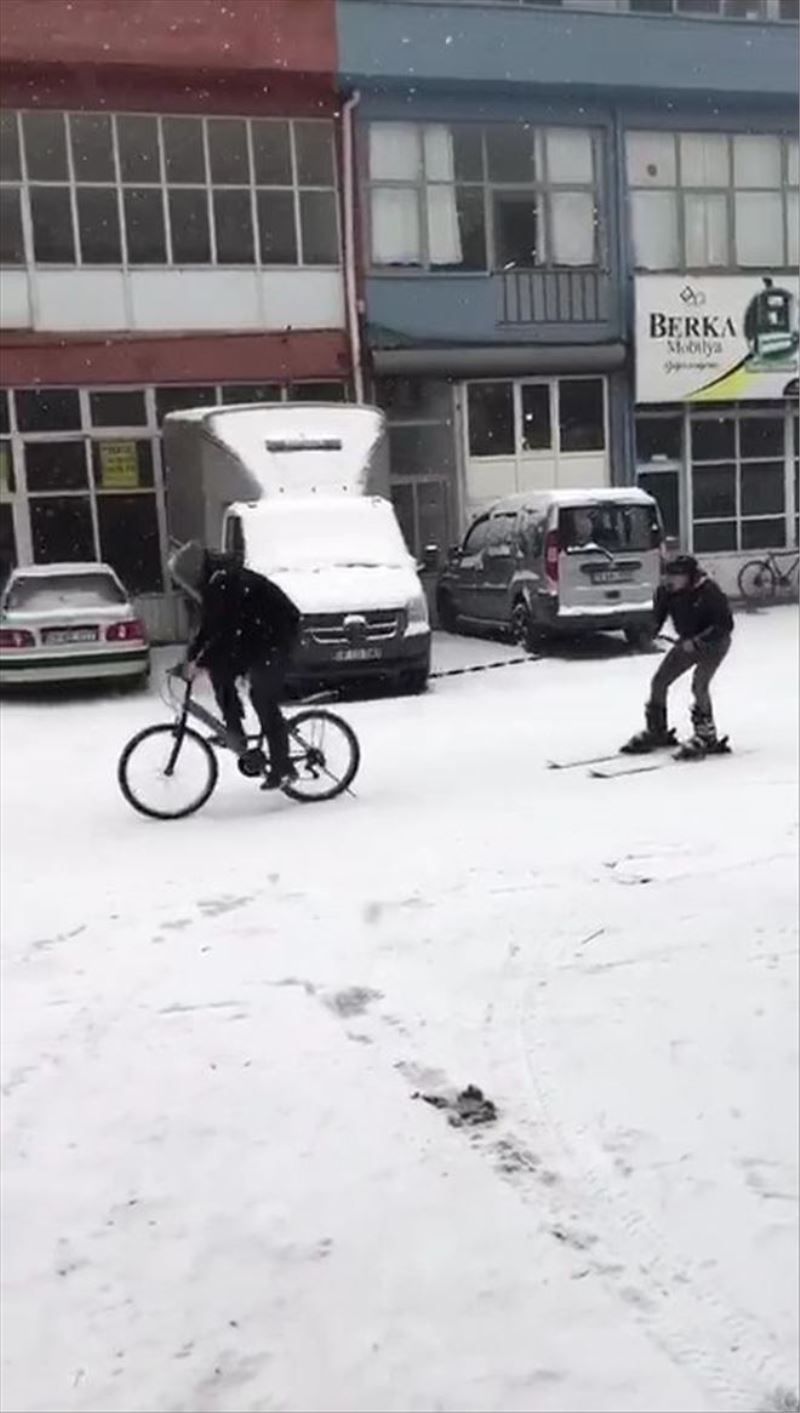 Kentte bir gün aradan sonra yeniden etkisini gösteren kar yağışı ve soğuk hava hayatı olumsuz etkiliyor. Beyaza bürünen kentte kar yağışı bazıları için ise eğlenceye dönüştü. Bağ - Essan Sanayi Sitesi´nde karla kaplı yolda bir kişi kayak takımlarını giyerek önce yol boyunca kayak yaptı, ardından ise bisikletin arkasına bağlanan halattan tutunarak kayak yaparak karın keyfini çıkardı. Yaşanan o anlar ise vatandaşların cep telefonuna yansıdı.