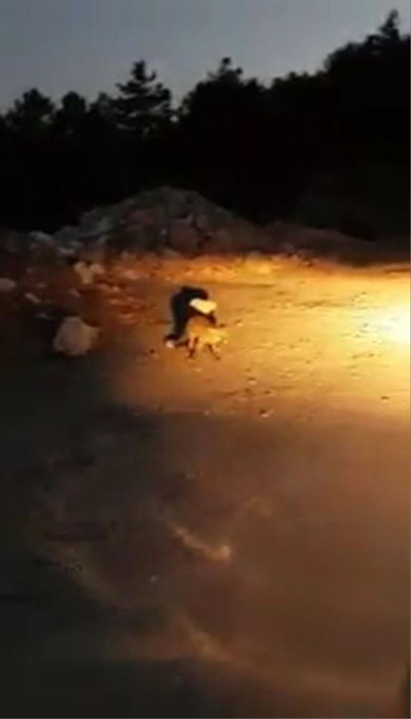 Aracını durduran Kahraman, yanında bulunan yiyeceklerden tilkiye vererek besledi. Kahraman´ın verdiği ekmekleri yiyen tilki bir kısmını da yuvasına götürdü. Kahraman ise o anları cep telefonuyla kaydetti.