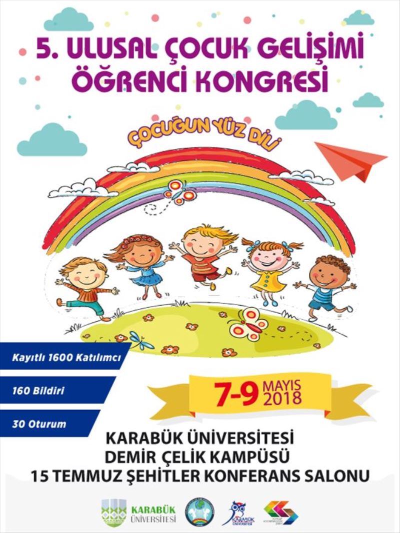 Karabük Üniversitesi Sağlık Bilimleri Fakültesi Çocuk Gelişimi Bölümü tarafından 7 - 9 Mayıs tarihleri arasında düzenlenecek 5. Ulusal Çocuk Gelişimi Öğrenci Kongresi´nin 1600 katılımcıyla üniversitenin en kapsamlı ve kalabalık kongrelerinden biri olması bekleniyor. Çocuk ve çocukluğa ilişkin konuların farklı bakış açılarından ele alınacağı kongrede akademisyenlerin sunumları ve öğrencilerin serbest bildirilerinin yanı sıra 7 çalıştay, 2 sergi, 3 panel ve 1 konferans gerçekleştirilecek.