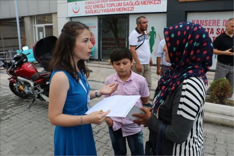 Kdz. Ereğli TSM personeli tarafından Şehit Ömer Halisdemir Bulvarı üzerinde stant kurularak, Türkiye Yeşilay Cemiyeti´nden temin edilen broşürler vatandaşlara dağıtıldı. TSM Başkanı Uzman Dr. Fatoş Taymez, madde bağımlılığının tüm dünya genelindeki toplumların temel sağlık sorunlarından biri olduğunu ifade etti. Dr. Taymez açıklamasında şu görüşlere yer verdi; “Sağlık” kavramı Dünya Sağlık Örgütü tarafından sadece hastalık ve sakatlık durumunun olmayışı değil kişinin bedenen, ruhen ve sosyal yönden tam bir iyilik hali olarak tanımlanmaktadır. Madde bağımlılığı ise bireyi, ailesini ve toplumu bedenen, ruhen ve sosyal açıdan tehdit eden en önemli halk sağlığı sorunlarından biridir. Madde bağımlılığı tüm dünya genelindeki toplumların temel sağlık sorunlarından biridir. Sadece kullanılan maddenin ortaya çıkardığı yan etkiler değil, yol açtığı sosyal sorunlar ve fiziksel hastalıklar ele alındığında, bireysel ve toplumsal maliyeti yüksek hastalıklar arasında yer almaktadır. Bağımlılık yapıcı maddeler, merkezi sinir sistemi üzerinde, sahte bir iyi oluş hali oluşturan unsurlardır. Madde kullanımının yol açtığı fiziksel hastalıklar çok çeşitlidir. Uçucu madde bağımlılığı, direk beyine etki etmesi sebebiyle, sinir hücrelerinde doğrudan harabiyete neden olarak geri dönüşü imkansız beyin hastalıklarına yol açabilir. Damar yoluyla bağımlılık yapıcı madde kullananlar ise aynı zamanda AIDS, Hepatit B, Hepatit C gibi hayatı ve toplum sağlığını tehdit eden hastalıklara daima açıktır. Madde kullanımının neden olduğu, fiziksel hastalıklar bunlarla sınırlı kalmamakta, karaciğer ve böbrek yetmezliği, damar hastalıkları ile depresyon ve benzeri ruhsal hastalıklara yol açmaktadır. Hızla gelişen ülkemizde kırsal kesimlerden kentlere göç artmış, bu hızlı kentleşme beraberinde çeşitli sorunlar ortaya çıkarmıştır. Bu olumsuz durumlar da insanları farklı doyum noktalarına itmektedir. Öte yandan uyuşturucu maddelerin satışlarının sokaklara kadar inmesi, kolay ulaşılabilir hale gelmesi kişileri madde bağımlılığı tehlikesi ile karşı karşıya bırakmaktadır. Risk grubu olarak nitelenebilecek gençlerimizi bu tehdide götüren unsurlar, akran etkisi, gruptan atılma korkusu, heyecan ve macera arayışı, merak ve özenti gibi sebepler olup bu sebepler bu tür maddelere yönlendirmektedir. Bağımlılıkla mücadelede sağlık çalışmalarının en verimli ve uzun vadede en çok fayda sağlayan kısmını, kullanmayı önleyici sağlık hizmetleri oluşturmaktadır. Alkol, sigara da dahil olmak üzere bağımlılık yapıcı maddelerle mücadelede, önleyici sağlık hizmetleri büyük önem teşkil etmektedir. Bu sebeple bugün burada Kdz. Ereğli Toplum Sağlığı Merkezimiz personelince uyuşturucu ile mücadele konusunda toplumun bilinçlendirilmesi amacıyla Zonguldak Halk Sağlığı Müdürlüğü´ne ait Sağlıklı Yaşam Aracı içine stant kurulmuş ve bu stantta Türkiye Yeşilay Cemiyeti´nden temin edilen broşürler lise öğrencileri başta olmak üzere halka dağıtılması sağlanmıştır. Ayrıca Kdz. Ereğli Toplum Sağlığı Merkezi´mizde görevli Psikolog Hülya Usta tarafından vatandaşlarımıza konu ile ilgili bilgilendirme yapılmaktadır. Risk grubundaki gençlerimizi bu tür kötü alışkanlıklardan korumak amacıyla bu ve bunun gibi etkinliklere bundan sonra da devam edilecektir' dedi.