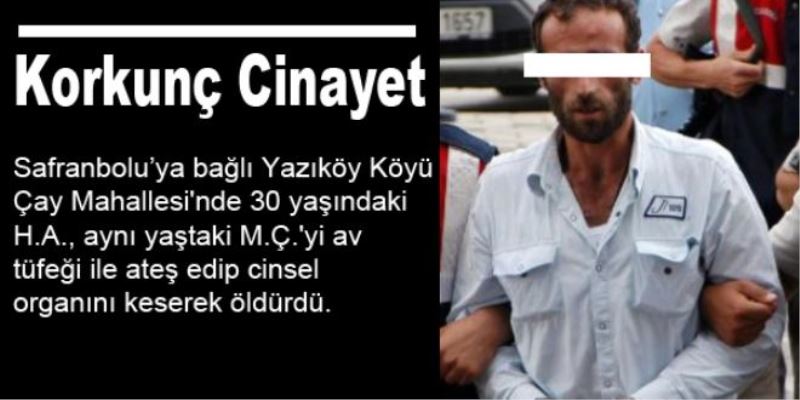 Safranbolu`ya bağlı Yazıköy Köyü Çay Mahallesi`nde 30 yaşındaki H.A., aynı yaştaki M.Ç.`yi av tüfeği ile ateş edip cinsel organını keserek öldürdü.