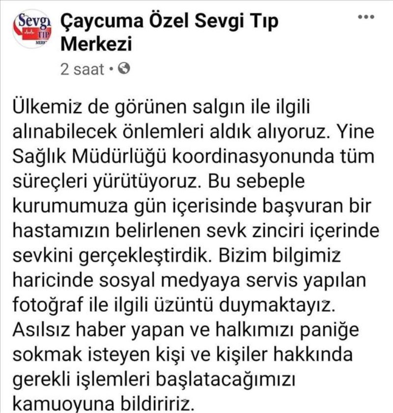 Edinilen bilgiye göre Zonguldak´ın Çaycuma ilçesinde bulunan özel bir hastanenin önünde çekilen fotoğraf ile asılsız haber yapanlar hakkında hastane sahibi şikayetçi oldu. Hastane sahibi Naim Akça sosyal medya hesabından yaptığı açıklamada, 'Ülkemiz de görünen salgın ile ilgili alınabilecek önlemleri aldık alıyoruz. Yine Sağlık Müdürlüğü koordinasyonunda tüm süreçleri yürütüyoruz. Bu sebeple kurumumuza gün içerisinde başvuran bir hastamızın belirlenen sevk zinciri içerinde sevkini gerçekleştirdik. Bizim bilgimiz haricinde sosyal medyaya servis yapılan fotoğraf ile ilgili üzüntü duymaktayız. Asılsız haber yapan ve halkımızı paniğe sokmak isteyen kişi ve kişiler hakkında gerekli işlemleri başlatacağımızı kamuoyuna bildiririz' ifadelerine yer verdi.