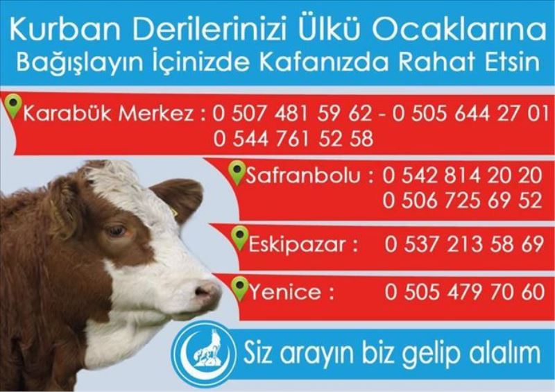 Türk milletinin teminatı olan, vatanın ve milletin bölünmez bütünlüğünü canından daha fazla düşünen, yaptıklarını ve yapacaklarını Allah rızası için yapan, Allah´tan başka hiç kimseye ve hiçbir şeye boynunu eğmeyen, dik duruşlu vatan evlatlarına destekte bulunmak için Karabük Ülkü Ocakları Eğitim ve Kültür Vakfı Yönetim Kurulu, mübarek Kurban Bayramı´nda Yüce Allah´ın rahmetine yaklaşmak için ibadet niyetiyle kesilen kurbanların derilerini Ülkü Ocakları Eğitim ve Kültür Vakfına bağışlanmasını isteyerek haber verildiği takdirde derinin bağışlanacağı yerden alınacağını belirtti.