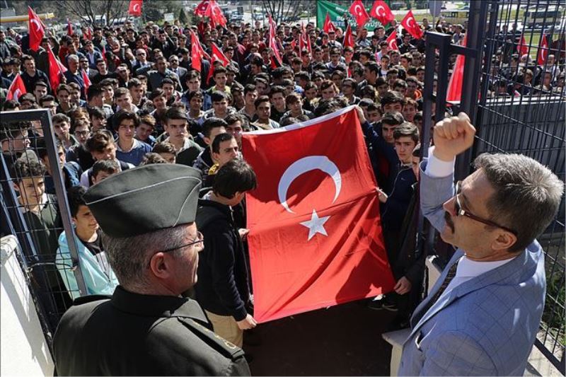 “Her Türk asker doğar” sloganları atan öğrenciler, daha sonra eski belediye binasının önüne kadar yürüyüşlerine devam etti. Burada dev Türk bayrağı açan öğrenci ve öğretmenler İstiklal Marşı´nı okudu. Burada da kısa bir konuşma yapan Okul Müdürü Taşlıyan, “Yiğitlik özümüz, şudur sözümüz; memleketin meselesi meslek lisesi. Bizim meselemiz vatan sevdası. Kansa kan, cansa can. Biz her zaman hazırız. Yeter ki sağ olsun vatan” diye konuştu.