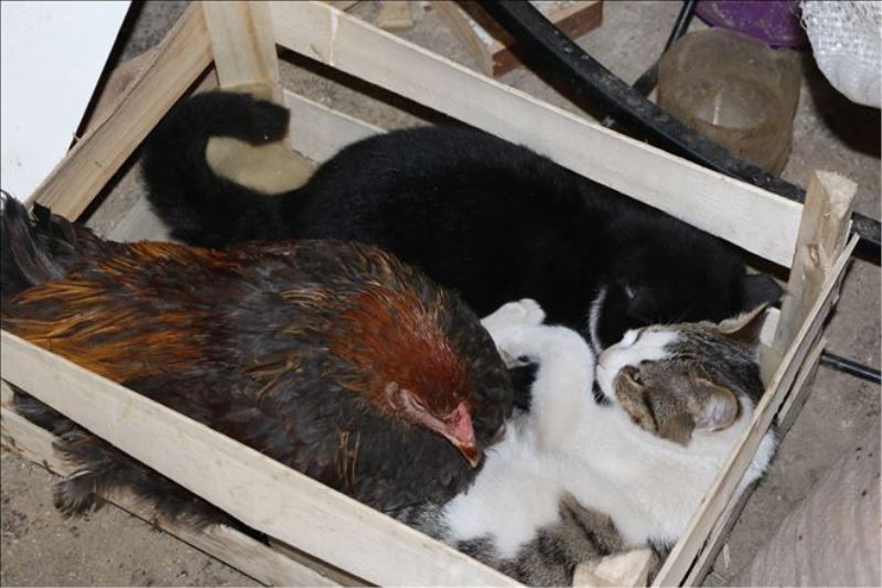 Marangoz ustası Serkan Sevingen, atölyesinde tavuk ve horozların bulunduğunu bunun yanında ayrı ayrı iki tane kediyi sahiplendiğini söyleyerek, tavukların yanına aldığı başka horozun onlarla geçinemeyince kedilerle dostluk kurduğunu söyledi.