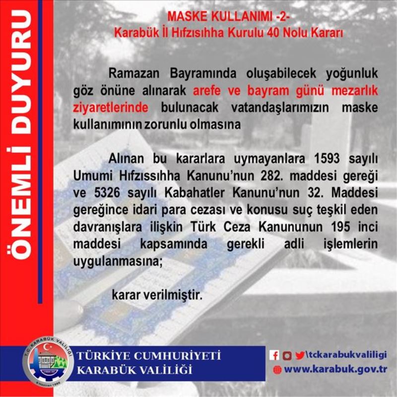 Karabük İl Hıfzıssıhha Kurulu tarafından alınan karar doğrultusunda Ramazan Bayramında oluşabilecek yoğunluklar göz önüne alınarak arefe ve bayram günü mezarlık ziyaretlerinde bulunacak vatandaşların maske kullanımı zorunlu hale getirildi. Alınan bu kararlara uymayanların 1593 sayılı Umumi Hıfzıssıhha Kanunu´nun 282. Maddesi gereği ve 5326 sayılı Kabahatler Kanunu´nun 32. Maddesi gereğince idari para cezası ve konusu suç teşkil eden davranışlara ilişkin Türk Ceza Kanununun 195 inci maddesi kapsamında gerekli adli işlemler uygulanmasına karar verildiği belirtildi.