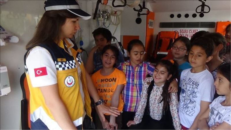 Salondaki bilgilendirme toplantısının ardından okulun bahçesinde düzenlenen etkinlikte ise ambulans ve ekipmanlarının nasıl kullanıldığı, emniyet kemerinin ve kaskın nasıl takıldığı görevliler tarafından öğrencilere anlatıldı. Çocuklar, ambulansa binerek içindeki cihazları ve tıbbi donanımı yakından görme şansı bulurken, trafik polislerinin kullandığı motosiklete ve otomobile de bindi.