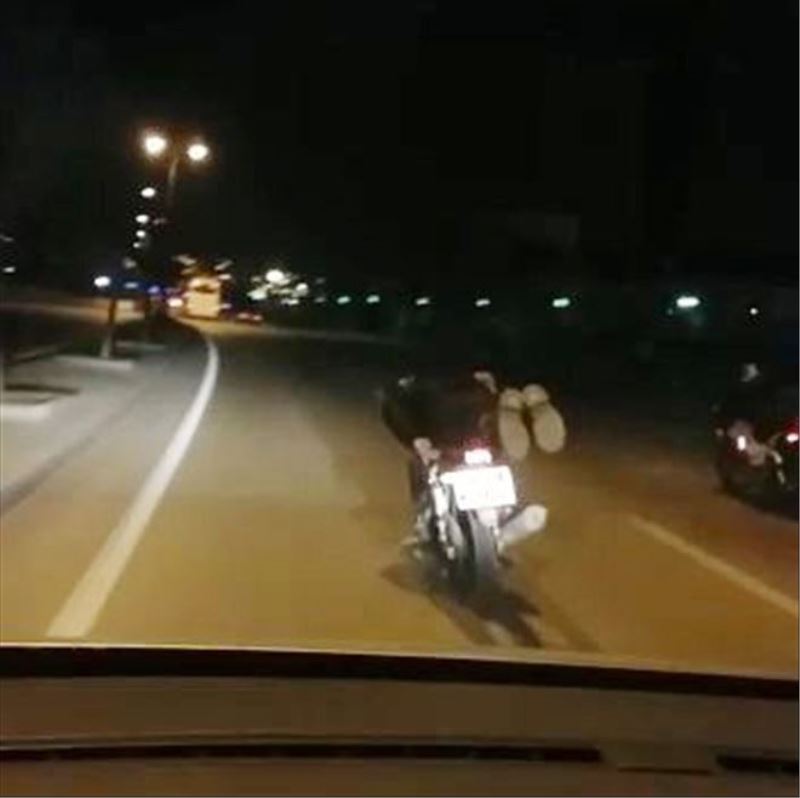Karabük´te çevreyolu üzerinde yatarak yolculuk yapan ve adeta ölüme meydan okuyan iki motosiklet sürücüsü, görenleri hayrete düşürdü. Kimliği öğrenilemeyen iki motosiklet sürücüsünün yaptığı tehlikeli hareketler trafikte korku dolu anların yaşanmasına neden oldu. Ayaklarını da havaya kaldıran sürücü, kendi canını hiçe saydığı gibi trafikteki diğer sürücüleri de tehlikeye attı. Kasksız motosikletlinin tehlikeli şovu ise diğer sürücüler tarafından saniye saniye görüntülendi.