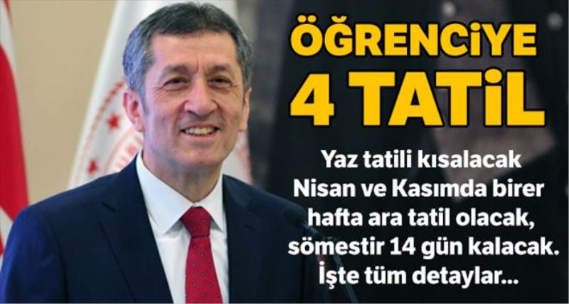Çocukların sınıfa giriş hızı ile sınıftan çıkış hızları arasındaki farkın ortadan kaldırılması için yeni bir adım atıldı. Türkiye´deki okullarda 90 yıldır devam eden 13 haftalık yaz tatili uygulaması değişti... Amerika başta olmak üzere birçok ülkenin uyguladığı modele geçildi. Daha önce revizyon sinyali veren Millî Eğitim Bakanı Ziya Selçuk yeni düzenlemeyi anlattı. Okullarda, gelecek yıldan itibaren nisan ve kasım aylarında birer haftalık iki ara tatil yapılacak. Buna göre, 13 haftalık yaz tatili süresi, öğrencilerin öğrenme motivasyonlarını kaybedecek kadar okuldan uzaklaşmamaları için 11 hafta olarak düzenlendi. Yeni modele göre artık okullar bir hafta erken açılacak, bir hafta daha geç kapanacak. Ancak bu durum toplam tatil süresini kısaltmayacak. Her ana tatilin bir teması olacak ve çalışmalar bu format üzerinden yapılacak. Öğretmenlerin tatil takviminde ise değişiklik olmayacak. Sadece eğitim yılı kapanışı ve açılışındaki seminer dönemlerinin birer haftası yıl içerisine alınacak. Uzmanların bir sonraki adımda ise beklentileri bölgelere göre tatil düzenlemesi...
