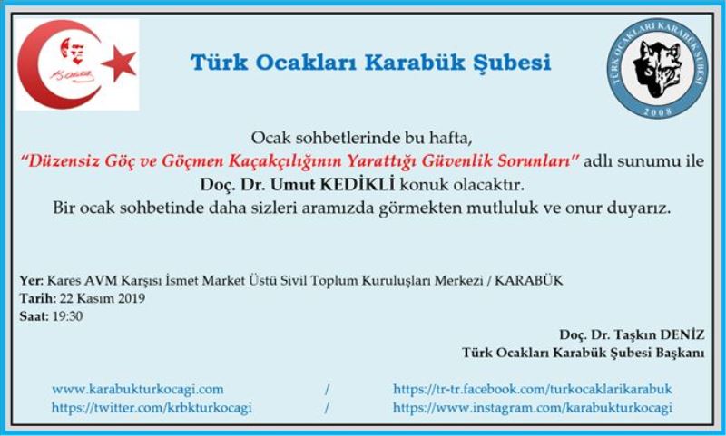 Karabük Türk Ocakları Şubesi Başkanı Taşkın Deniz, “Ocak sohbetlerinde bu hafta ´Düzensiz Göç ve Göçmen Kaçakçılığının Yarattığı Güvenlik Sorunları´ adlı sunumu ile Doç. Dr. Umut Kedikli olacaktır. Bir ocak sohbetinde daha sizleri aramızda görmekten mutluluk ve onur duyarız” dedi.
