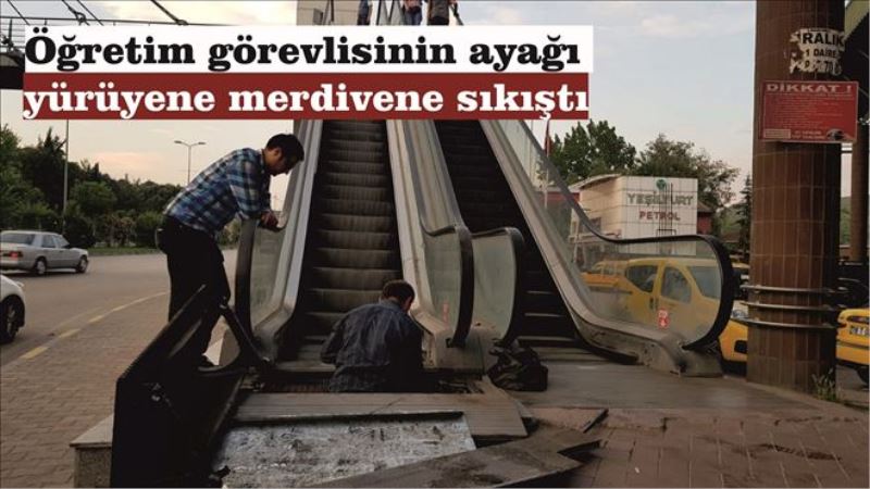 Öğretim görevlisinin ayağı yürüyene merdivene sıkıştı
