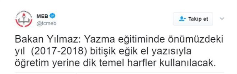 Milli Eğitim Bakanı İsmet Yılmaz, eğitim-öğretimde büyük ümitlerle başlatılan eğik yazı yani al yazısı döneminin önümüzdeki yıl biteceğini açıkladı. MEB twitter hesabından şu açıklamayı yaptı, 'Yazma eğitiminde önümüzdeki yıl (2017-2018) bitişik eğik el yazısıyla öğretim yerine dik temel harfler kullanılacak'