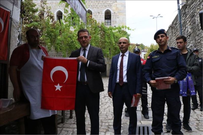 Safranbolu Kaymakamı Fatih Ürkmezer, İlçe Emniyet Müdürü Osman Gül, İlçe Jandarma Komutanı Jandarma Üsteğmen Emrah Aydın tarafından Tarihi Çarşı bölgesinde bulunan esnaflara Türk bayrağı dağıtıldı.