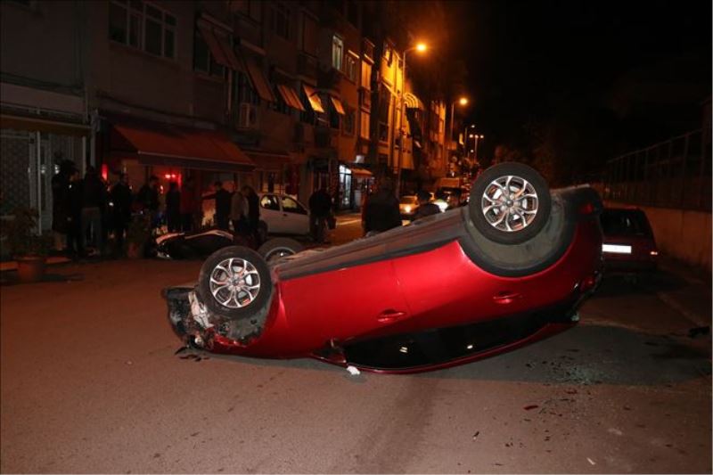 Otomobil park halindeki araçlara çarpıp ters döndü: 2 yaralı